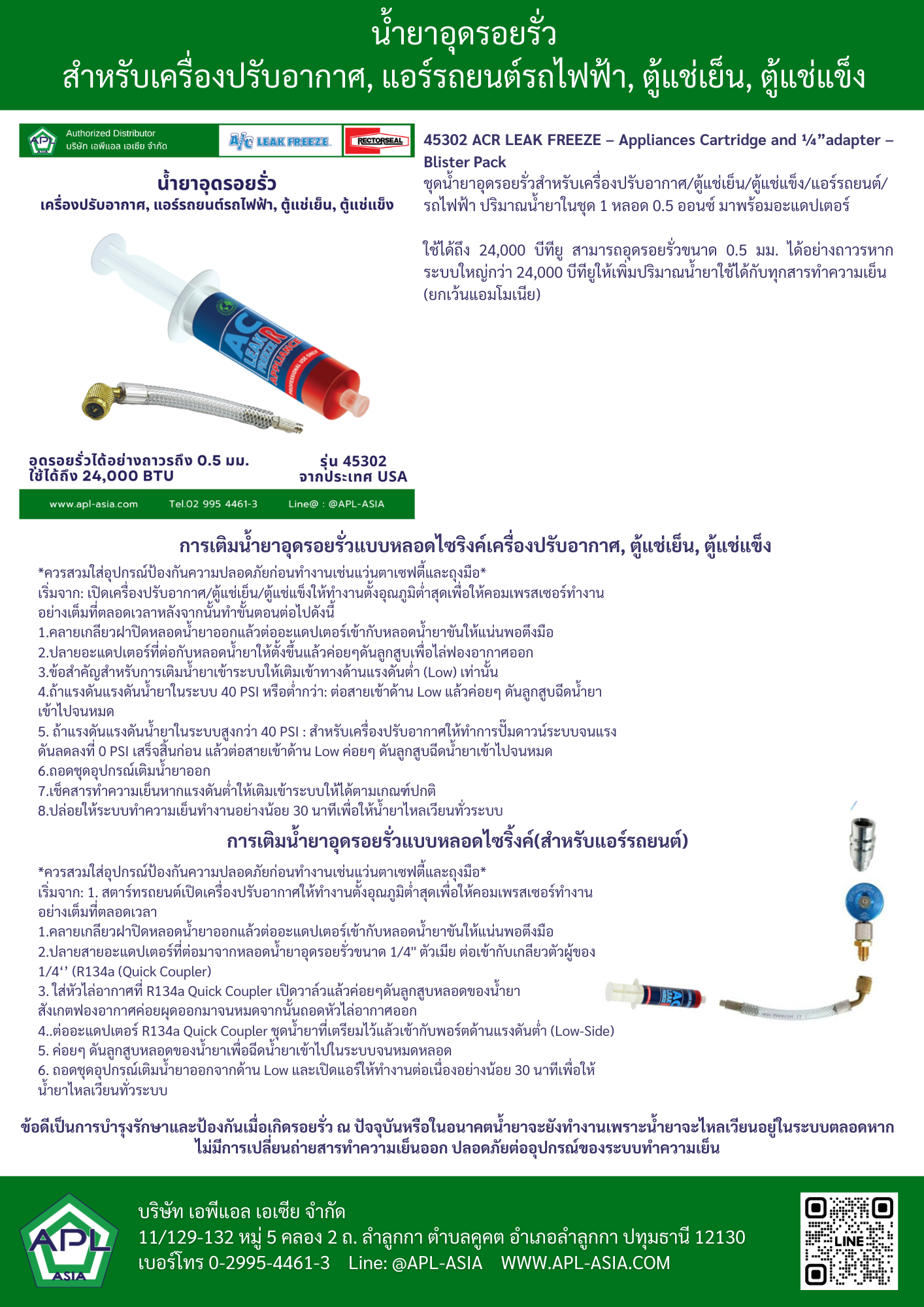 รหัสสินค้า P/N. 45302 ACR LEAK FREEZE - Appliances Cartridge and ¼”adapter – Blister Pack