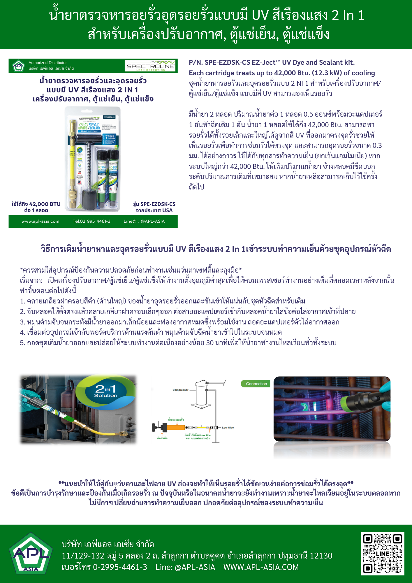 รหัสสินค้า P/N. SPE-EZDSK-CS EZ-Ject™ UV Dye and Sealant kit Each cartridge treats up to 3.5 tons (12.3 kW) of cooling