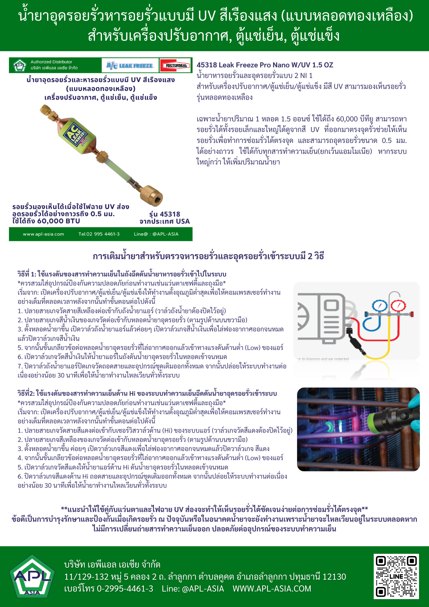 ✅ น้ำยาอุดรอยรั่วและหารอยรั่วสำหรับเครื่องปรับอากาศ/ตู้แช่เย็น/ตู้แช่แข็ง มีสี UV