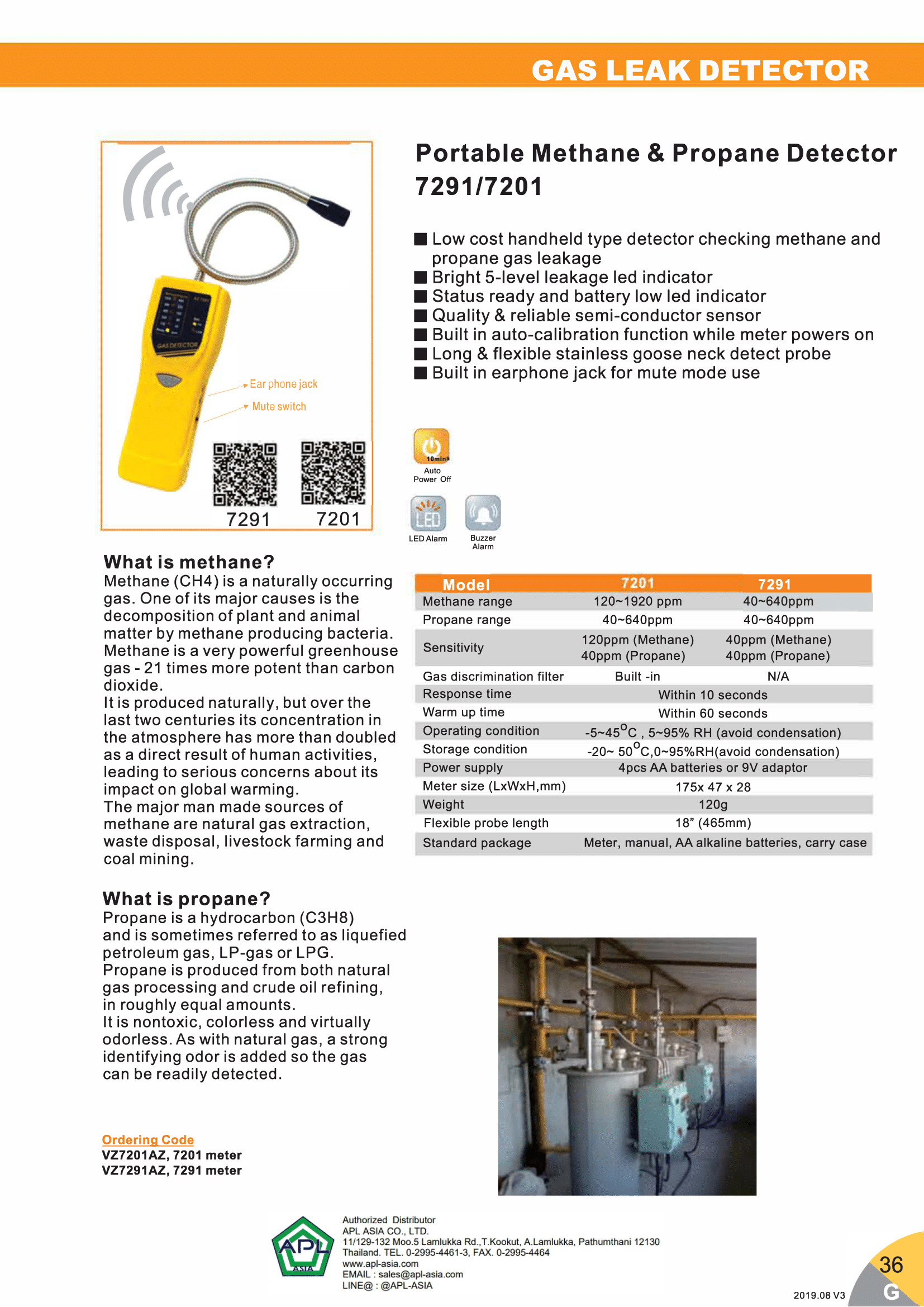 AZ 7201 เครื่องตรวจจับการรั่วไหลของมีเทนและโพรเพน